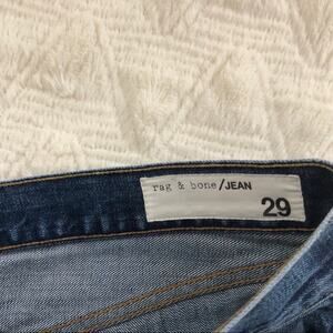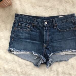 In good preowned condition, barely worn. 100% cotton. Front and back pockets. Light fading and whiskering along front. Frayed raw cut hem. High rise.