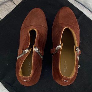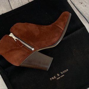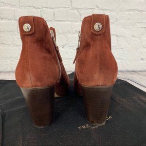 New in box w dust bag Side zip details accentuate a suede cap toe boot with a trendy stacked block heel. Sizing: True to size. Reference size chart for European conversion. - Round cap toe - Suede construction - Side zip detail - Side zip closure - Stacked block heel - Approx. 2" shaft height - Approx. 4" heel - Made in Italy Materials Suede upper, leather lining and sole