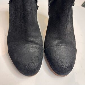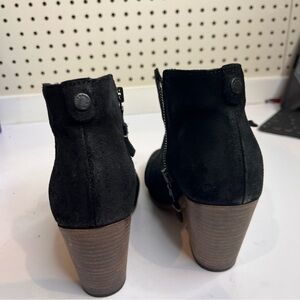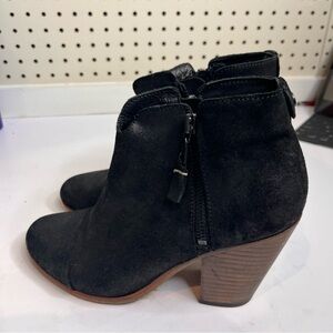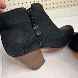 Black Suede, ankle boots. 3.5 wood stacked heel. Zipper on both sides.
