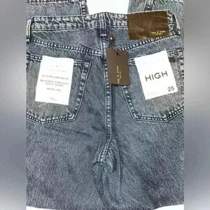 A high rise, wide leg jean that sits snug at the waist and features an ultra-relaxed cut through the legs, a dagger center front button, washer rivets, and a clean finish hem with grinding.