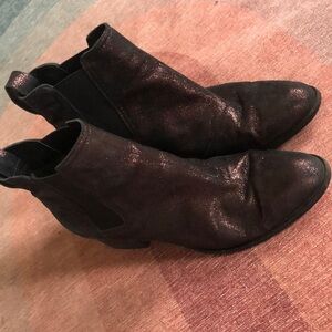 great pre loved condition size 8, 38.5, copper metallic suede booties, genuine leather, easy slip on, pull tabs at back, small heel, pointed toe, awesome pair of ankle booties , great for transitional weather