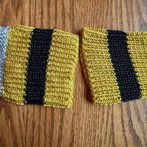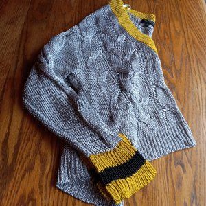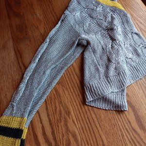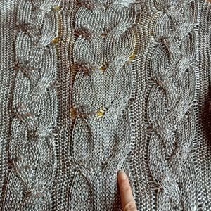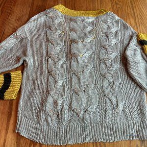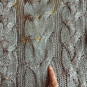 Metallic silver open knit Emma sweater lends an edgy take on cable knit from Rag & Bone. Contrast golden yellow v neck and golden yellow with black striped cuffs. Slightly shorter in front than back. Has been stored in a drawer not on hanger (in order to prevent stretching/mishaping). Works for the holidays or for office/everyday. The viscose has a nice feel and weight. I find the silver in particular makes my face glow/light up. There were a couple pulls/loosened threads in the back and sleeves but I was able to simply pull the thread through to the interior to tighten it so they are not visible from the exterior. See photos wear I point out an example on the back. Otherwise like new.
