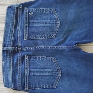 12.5" waist, 8" front rise, 12 1/2" back rise, 28" inseam, 35 1/2" signature hand stitched "rb" embroidery, at back pocket, dark wash with gold thread, silvertone logo-etched rivets and hardware, dark blue stretchy denim, whiskering along front pockets, fading along front and back pockets, zip fly front button closure, five pockets, belt loops, measurements are approx.
