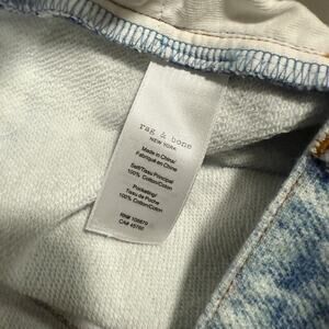 Rag & Bone Miramar Sofie Wide Leg Pant in Meadow Blue. Women's Size 26. Features super wide leg with flared hems, functional belt loops, front scoop pockets, zip fly, and a button closure, the high rise style further achieves its comfortable fit and feel with the back pockets and other denim details digitally printed on the fabric. 100% cotton. Great used condition, no notable flaws. Retail $258.