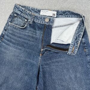 Women's Rag and Bone Sofie Miramar Wide Leg Baggy Faux Denim Printed Stretch Zipper Fly Button Closure Cotton Terry Cloth Flared Hem Functional Belt Loops and Front Scoop Pockets Kimber Medium/Dark Wash Pants Jeans. Style ABS2803. 78% cotton, 20% polyester, 2% spandex.