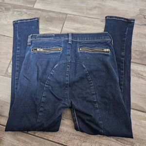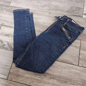 This is a pair of skinny jeans by Rag & Bone. They have moto style zipper details on the thighs, back, and ankles as shown in the photos. The color name is Soft Harrow. At the fly are two snap buttons.
