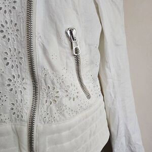 This is a moto style jacket by Rag & Bone. It has an asymmetrical zipper on the front as well as two zippered pockets and zippers on the cuffs This jacket is white with off white accents and floral embroidered eyelet detailing. Note the mark on the back of the collar as shown in the photos. There is an extra button sewn inside of this jacket.