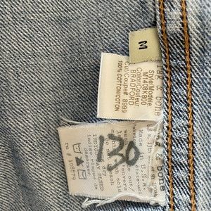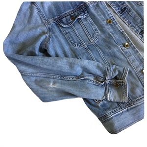 Rag & bone Distresses light washed oversized denim jacket has 2 button flap front pockets and 2 side seam pockets. Light to mid-weight; 100% Cotton. Small worn spot on right elbow (see photo) that can easily be reinforced or patched from inside.