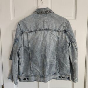 Long sleeve non-stretch denim jacket in blue. Fading and distressing throughout. Spread collar. Button closure at front. Flap pockets at chest. Welt pockets at waist. Adjustable buttoned tabs at back hem. Black hardware. Contrast stitching in tan. Color: Olson.