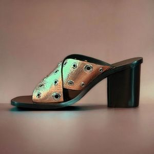 Keep it cutting edge and casual with the effortless look of the rag & bone Paige slide. Shimmering leather upper with crisscross style straps through the vamp decorated with silver-tone cylinder hardware eyelets. Soft leather lining. Block heel. Slip-on style. Open-toe design. Softly cushioned leather footbed with embossed brand name logo. Leather sole. Imported.