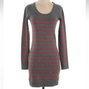 Stylish gray and rust orange striped sweater dress. Perfect for casual outings.