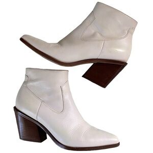 Rag & Bone’s Razor Western Ankle Boot in Antique White: This bootie features a pointed toe, angled block heel, and side zip closure. Western style updated in cream-toned leather with medium brown wood heel. Leather upper, lining and sole with rubber sole on heel. Color is called Antique White. 3 inch heel.
