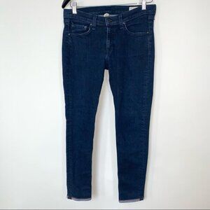Inky, dark-wash denim skinny capri jeans with clean, tonal stitching and year-round versatility.