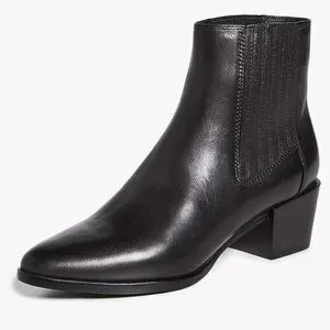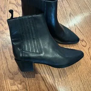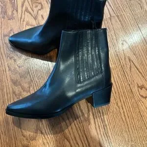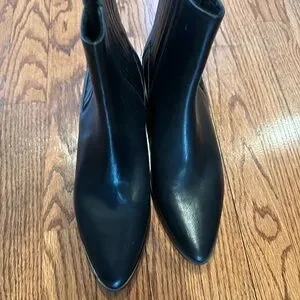 Sleek black leather ankle boot with a low block heel. Elastic side panels provide easy on-and-off wear. Polished design pairs seamlessly with dresses or jeans. Comfortable, versatile everyday boot in black.