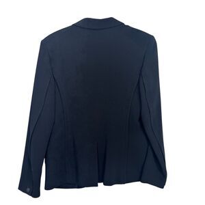 Lapel collar / Single hook & bar closure at front / Long sleeves with slightly padded shoulders & buttoned cuff / Welt pockets at sides / Shaping at front & back / Vent at back hem / Partially lined / 69% Triacetate, 31% Polyester / Made in US