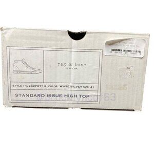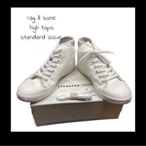 Summary: New in box. White and Silver Rag & Bone High Tops Standard Issue sneakers. Comes with extra set of Rag & Bone shoe laces.