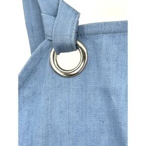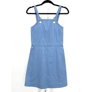 Perfect fit for Spring! A fitted shift dress in light wash denim twill with a square neckline and oversized silver rivets at the base of adjustable straps. Grab your wedges and your clutch and you're ready for the day.