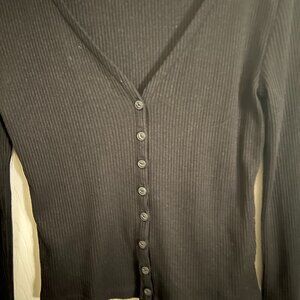Features: Ribbed knit, V-neck, button front, long sleeves