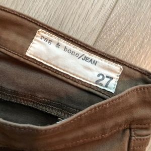 The Legging skinny jeans from Rag + Bone in a dark tan, brown color called "shitake brown" but is very flattering. The jeans are in good condition and incredibly comfortable with a lot of stretch. The are originally $195 so these are a steal. It's a size 26=2