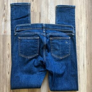 Women’s Mid Rise, Skinny Leg Jeans. Kingsland Wash, Dark Blue with Minimal Fading Throughout. Slight whiskering along front pockets.
