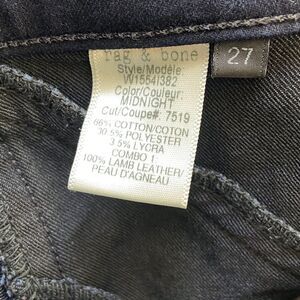 Rag & Bone The Trench Skinny Jeans Size 27 Midnight Blue/Black Lamb Leather Trim. Jeans are in great preowned condition. Very stretchy jegging style jeans in dark – almost black – midnight blue. Black trim along side seams, and on front sides to about the knee. Zip fly with button closure. 2 back patch pockets; "rb" logo embroidered on right pocket. Belt loops.