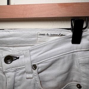 Classic and versatile, these Rag & Bone white skinny jeans are a wardrobe essential. Featuring a slim, flattering fit with raw hem detail, these jeans offer effortless style and year-round wear. Dress them down with sneakers and a tee or pair with heels and a blazer for a polished look.