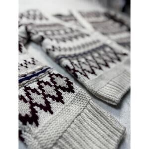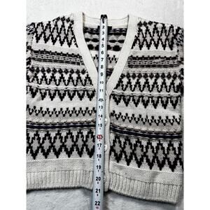 Women’s size medium, button front, ivory with burgundy + blue accents, wool-blend knit. Excellent pre-loved condition.