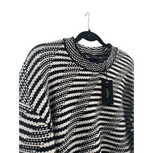 Super well made, this adorable mock neck sweater will carry you through winter with either jeans and sneakers or pair with a skirt and chunky boots! Black and white abstract pattern and slightly thick chunky weave- throw on and go!