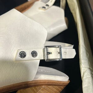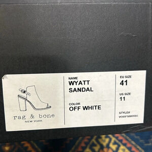 Rag & Bone women’s off white leather Wyatt sandal. Open toe. Chunky heel. Adjustable ankle strap with buckle. Some discolouration on left ankle strap as shown in pic. Comes with duster bag. Size 10.5/41. NIB