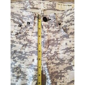 Update your wardrobe with these stylish Rag & Bone skinny jeans. The gray and white geometric print adds a modern touch to your outfit. The jeans feature a zip and button closure, low rise, and full length design. The cotton blend material is comfortable and durable, while the pockets provide ample storage space. The jeans are perfect for any occasion, whether you're going out for a night on the town or running errands. The size is 25, waist size is 26 inches, and inseam is 28.5 inches. The jeans are a regular fit and have a skinny leg style. They are not distressed, vintage, or personalized. The Rag & Bone logo accents the jeans, making them a great addition to your collection.