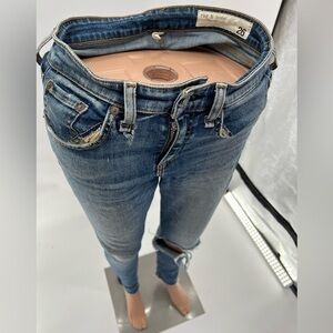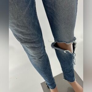 These Rag & Bone High Rise Skinny jeans are a stylish and trendy addition to any wardrobe. The distressed knees and light wash give them a unique and edgy look, and the size 26 ensures a comfortable and flattering fit. Please note that a rip at the right back pocket is visible in photo 6. Despite this flaw, these jeans are a fantastic choice for anyone looking to add personality to their outfit.