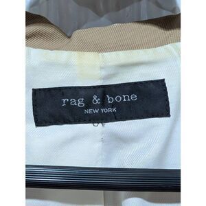 This Rag & Bone women's blazer in size Medium features a classic tan hue, offering a timeless and versatile look. Crafted from high-quality materials, it provides a tailored fit with long sleeves and a fully lined interior for added comfort. The blazer's minimalist design makes it suitable for both professional and casual settings. Its structured silhouette ensures a polished appearance, making it a staple piece for any wardrobe.