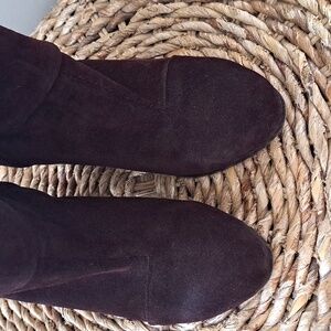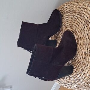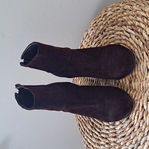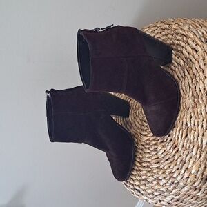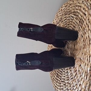 Luxury brand Rag & Bone burgundy/wine suede ankle booties with back heel zipper, 4" block wood heels and rounded toes. Pre-owned and in very gently used condition. Minor marks to suede and loose thread stitch on right sole. Please see pictures.