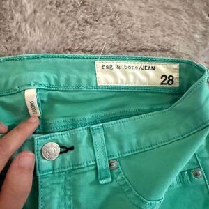 Elevate your wardrobe with these vibrant turquoise legging jeans from Rag & Bone. Crafted with a 96% cotton and 4% Roica blend, these jeans offer a comfortable and stylish fit. Designed with a sleek silhouette, they are perfect for casual outings or dressed up for a night out. Made in the USA.