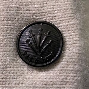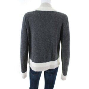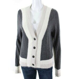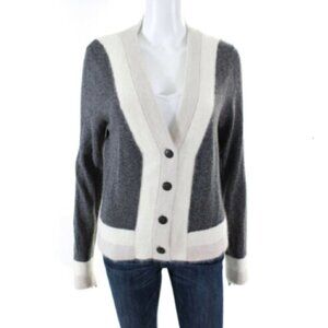 Dean striped wool-blend cardigan: gray wool-blend, V-neck, long sleeves, white trims. Button fastenings through front. 59% wool, 32% angora, 9% polyamide. Dry clean.