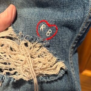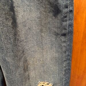 Rag & Bone X Boyfriend Embroidered Jeans. Whiskering on front along pockets. Distressed areas throughout. Women's size 28. Zip and button closure. There is some staining on front legs.