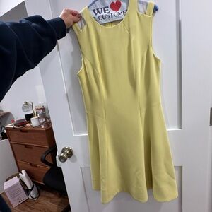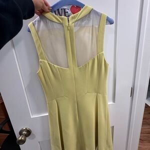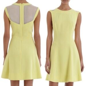 Elegant, yellow fit and flare dress with zipper down the back and silk sheer panels on either side as noted in the photo. Fully lined. Ideal for warm weather