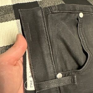 Authentic Rag & Bone amazing shape glitter coated dash stretchy charcoal black skinny dual snap exposed zipper jeans in womens size 27. Waist 13.5 length 37.5 inseam 26”