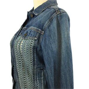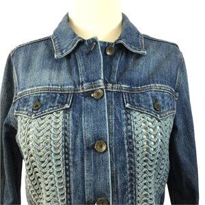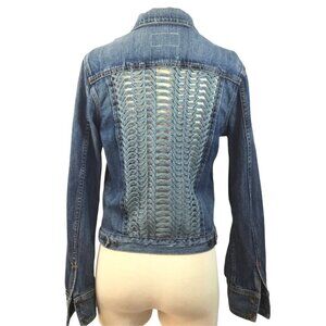 Rag & Bone jean jacket. Crochet panels in front and in back. Two side pockets. Please see pictures for more details. Measurements taken with item laying flat. Approximate measurments: Underarm to underarm: 17 3/4"