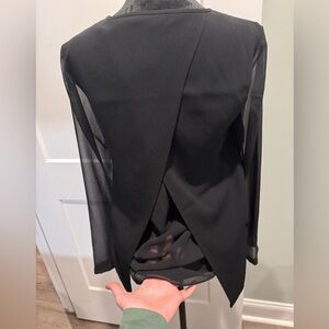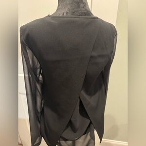 This elegant black top features stylish sheer sleeves, perfect for any occasion.