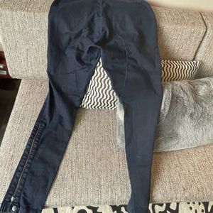 Very good condition, dark blue jeans with slight stretch and zipper detail on hip pockets. Zipper with snaps on ankle.