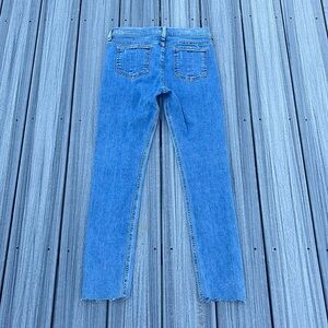 Rag & Bone - slightly distressed medium wash skinny blue jeans - mid rise - raw hem - in good pre owned condition - size 27
