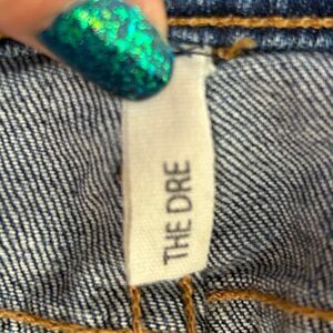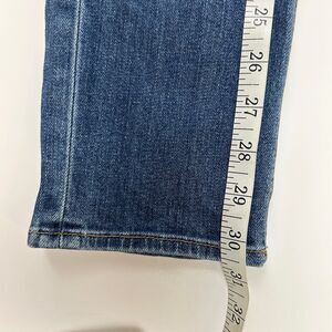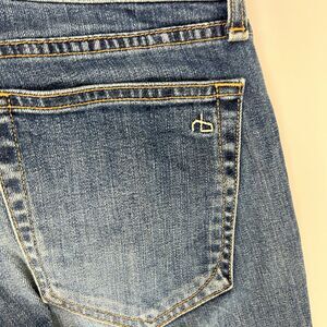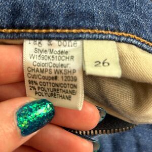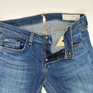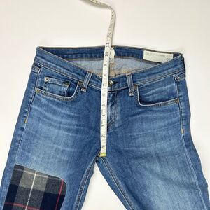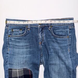rag & bone The Dre jeans in Champs, a medium blue wash denim with 90's grunge inspired plaid flannel patchwork detail. Low rise, slim tapered leg. Button and zip fly, 5 pocket design. Made in the USA, excellent used condition. Women's size 26, measurements pictured.