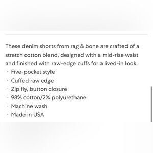 These blue jean shorts from rag & bone feature a stylish cuffed hem and a medium-light wash with subtle fading for a casual, lived-in look. Made from high-quality denim, they offer a comfortable fit perfect for everyday wear.