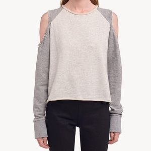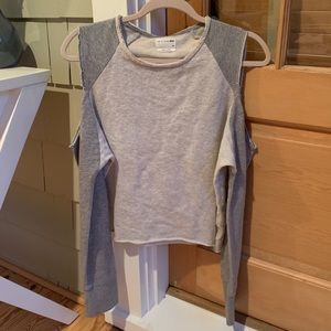 Super cute, comfortable pullover. Cut out shoulders, darker grey sleeves, light grey middle, very lightweight