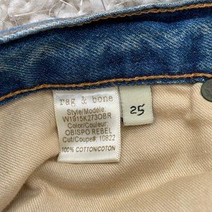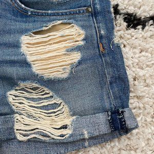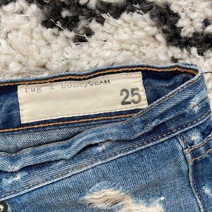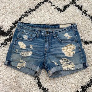 Heavily distressed Rag & Bone/JEAN denim shorts with shredded holes and rolled cuffs. 5-pocket styling. Single-button closure and zip fly.