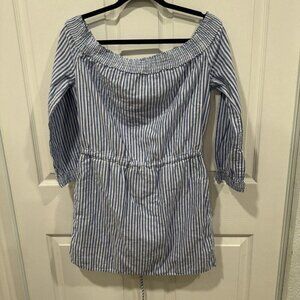 This beautiful Rag & Bone/Jean dress is perfect for any casual occasion. With an off-the-shoulder neckline and drawstring closure, it's both stylish and comfortable. Made from 100% cotton and machine washable, this short dress comes in a classic white color and features 3/4 sleeves. It's a shirt dress style and is designed for women in size small.