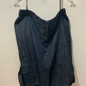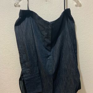 Off the shoulder button-down top can be worn higher or lower on shoulders. Elasticized in back. Indigo Blue 100% Chambray looks like denim but much softer. Tailored sleeves can be worn down or rolled up to reveal silk lining under cuff. Soft shirttail hem. Relaxed fit. Gorgeous high quality.