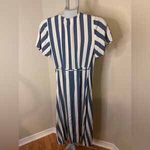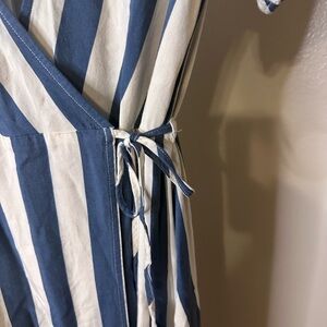 This elegant wrap dress features a v-neckline and flutter sleeves, perfect for casual or resort wear. The blue and white stripes add a classic touch, while the tie front accentuates the waist for a flattering silhouette. Its lightweight fabric ensures comfort and style in warm weather.