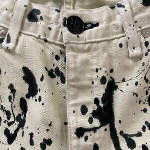 These acid-splatter Rag & Bone jeans are cut from sturdy cotton in a high-rise fit. Relaxed straight legs with five-pocket style. Zip/button front; belt loops. Color is pale yellow and black. Stock photo provided for reference. EUC!